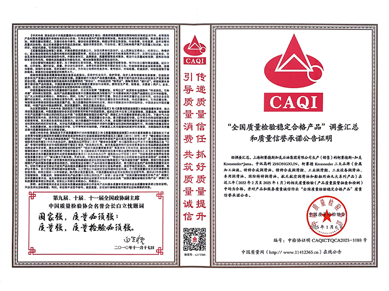At the beginning of the new year, Shanghai Kroneseder Jama Petroleum Group Co., Ltd. received a certificate from the China Quality Inspection Association (No.: CAOICTOCA2025-1088). The certificate said: After investigation and summary, Shanghai Kroneseder Jama Petroleum Group Co., Ltd. produces (sells) Kroneseder, ZHONGXUN, and Kroneseder·Jama lubricants. Three major brands (metalworking fluids, special synthetic lubricants, special synthetic greases, industrial greases, industrial equipment lubricants, automotive lubricants, defense special lubricants, aerospace lubricants and marine oils) have all passed the product quality supervision spot checks and inspections in the past three years (February 2022 to January 2025), and made a quality reputation commitment announcement of "National Quality Inspection Stable Qualified Products" for the quality of products and services.