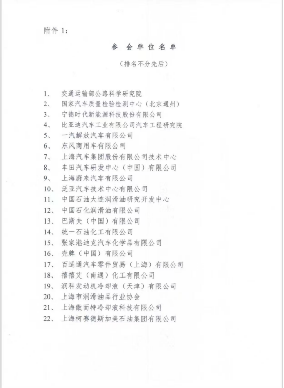 交通運輸部公路科學(xué)研究院、國家汽車質(zhì)量檢驗檢測中心(北京通州)、上??沦惖滤辜用朗图瘓F有限公司、寧德時代新能源科技股份有限公司、比亞迪汽車工業(yè)有限公司汽車工程研究院、一汽解放汽車有限公司、巴斯夫(中國)有限公司統(tǒng)一石油化工有限公司等單位參會。