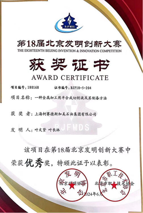日前,第18屆北京發(fā)明創(chuàng)新大賽頒獎(jiǎng)會(huì)在京成功舉辦,標(biāo)志著這場(chǎng)為期數(shù)月的科技盛會(huì)圓滿落幕。北京市人大常委會(huì)副主任閆傲霜、中國(guó)工程院院士侯立安等領(lǐng)導(dǎo)嘉賓親臨頒獎(jiǎng)會(huì)現(xiàn)場(chǎng),為獲獎(jiǎng)?wù)哳C發(fā)了榮譽(yù)證書(shū)。上??沦惖滤辜用朗图瘓F(tuán)有限公司的一項(xiàng)技術(shù),即“一種金屬加工用半合成切削液及其制備方法”,獲得本屆北京發(fā)明創(chuàng)新大賽的優(yōu)秀獎(jiǎng)。